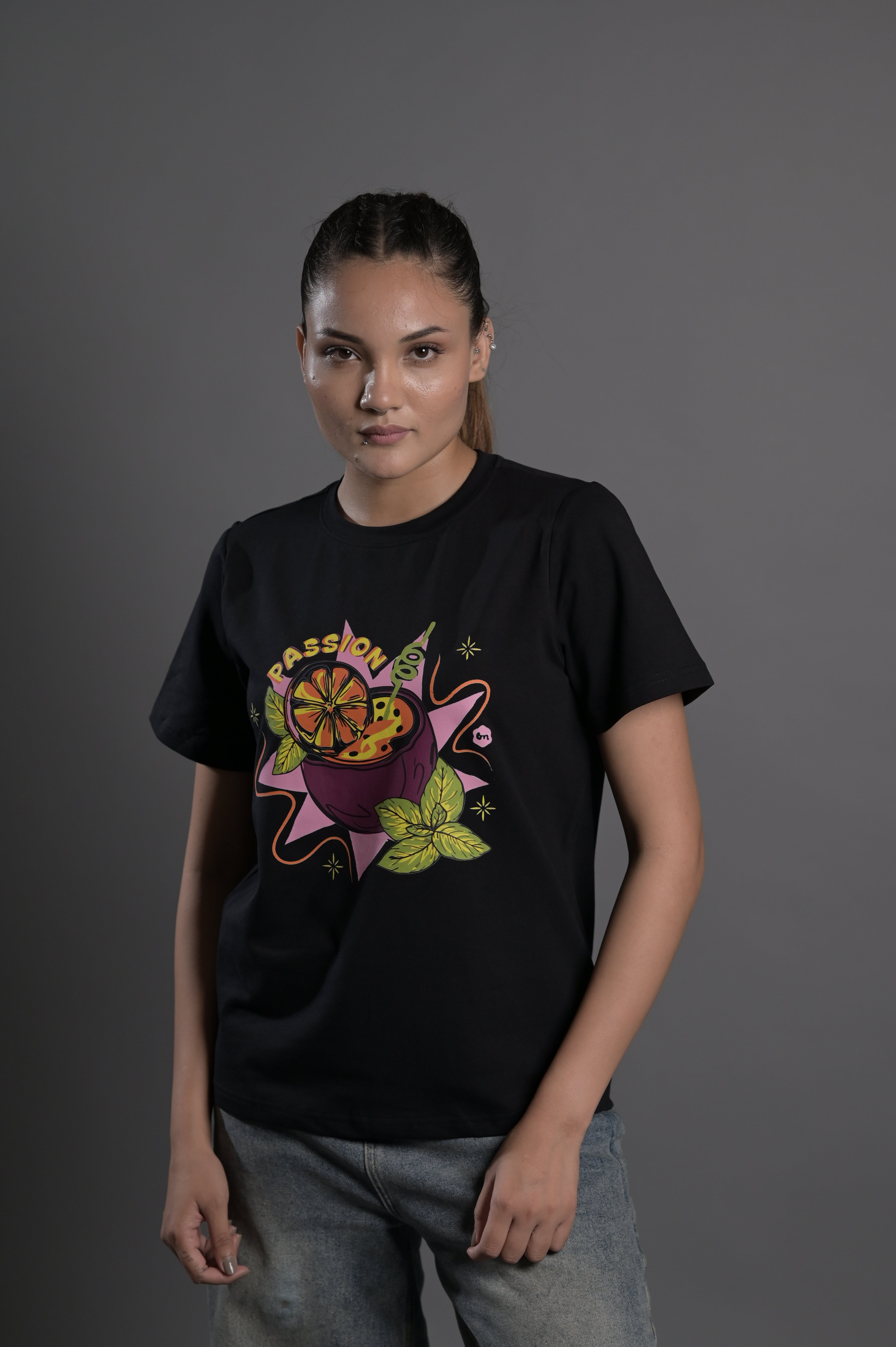 Bright passion fruit with stars and leaves, captioned 'Passion 100'