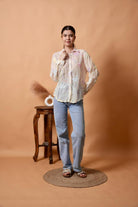 Ivory shirt adorned with pastel multicolored floral embroidery in a sheer organza blend.
