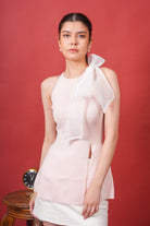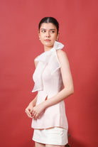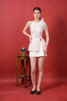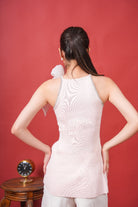 A blush pink sleeveless mini dress featuring crystal-embellished straps, a fitted silhouette, and a front slit for a bold yet elegant look.