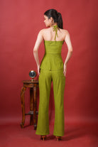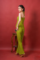 Brown co-ord set featuring a fitted ruched top and ribbed pants for a stylish casual vibe.