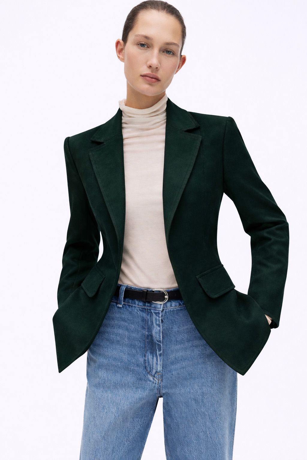 A tailored dark green blazer with a structured silhouette and waist-defining fit, designed for a polished and modern look suitable for both work and smart-casual wear.Ideal for professional wear or smart-casual outfits—pairs well with trousers, skirts, or dresses for a refined, modern look.