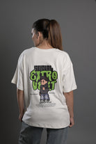 Playful oversized tee with cartoon character and bold 'Social Extrovert' text on the back.