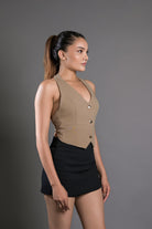 Step into modern sophistication with this taupe halter-neck vest — a timeless piece reimagined with a chic, contemporary twist. Featuring a flattering V-neckline, structured shoulders, and a cropped tailored fit, this vest effortlessly balances minimalism with bold style. The metallic button-down closure and mock welt pockets add refined detailing, making it versatile for both casual and formal looks.