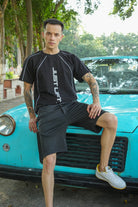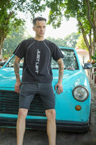 Bold gym wear t-shirt with 'JUST LIFT.' vertical print and contrast piping. Athletic and empowering.